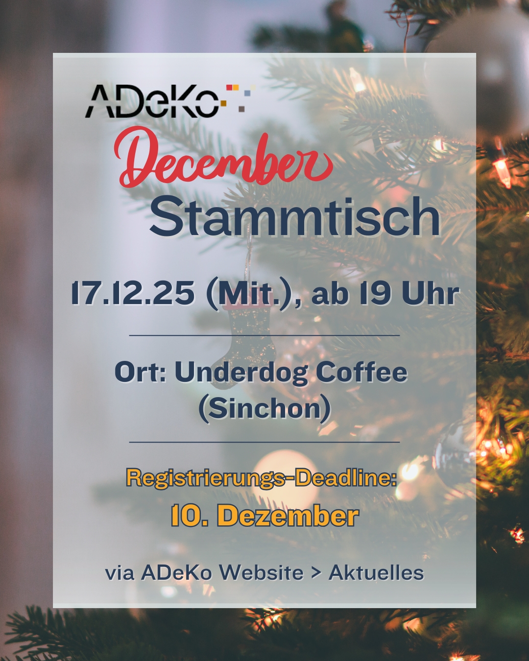 Bei unserem ADeKo Stammtisch könnt Ihr in lockerer Atmosphäre mit Menschen aus den unterschiedlichsten Bereichen und Altersgruppen ins Gespräch kommen und spannende Geschichten rund um Deutschland und Korea teilen.