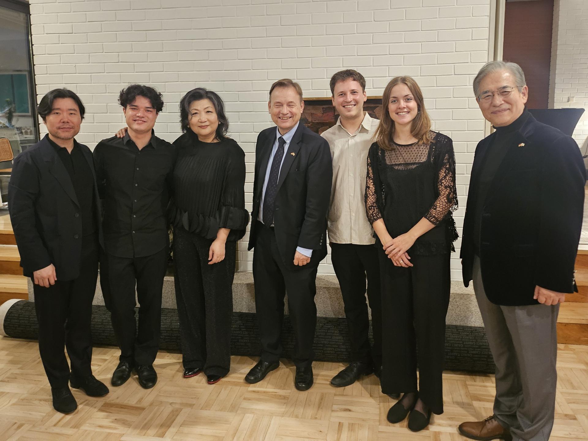 Von links nach rechts: Pianist Jong Hwa Park, Cellist Akito Marschik, Violinistin Mikyung Lee, Botschafter Georg Schmidt, Violinist Michael Nodel, Bratschistin Aurelia Hoever, ADeKo-Vorsitzender Hyo-Joon Kim