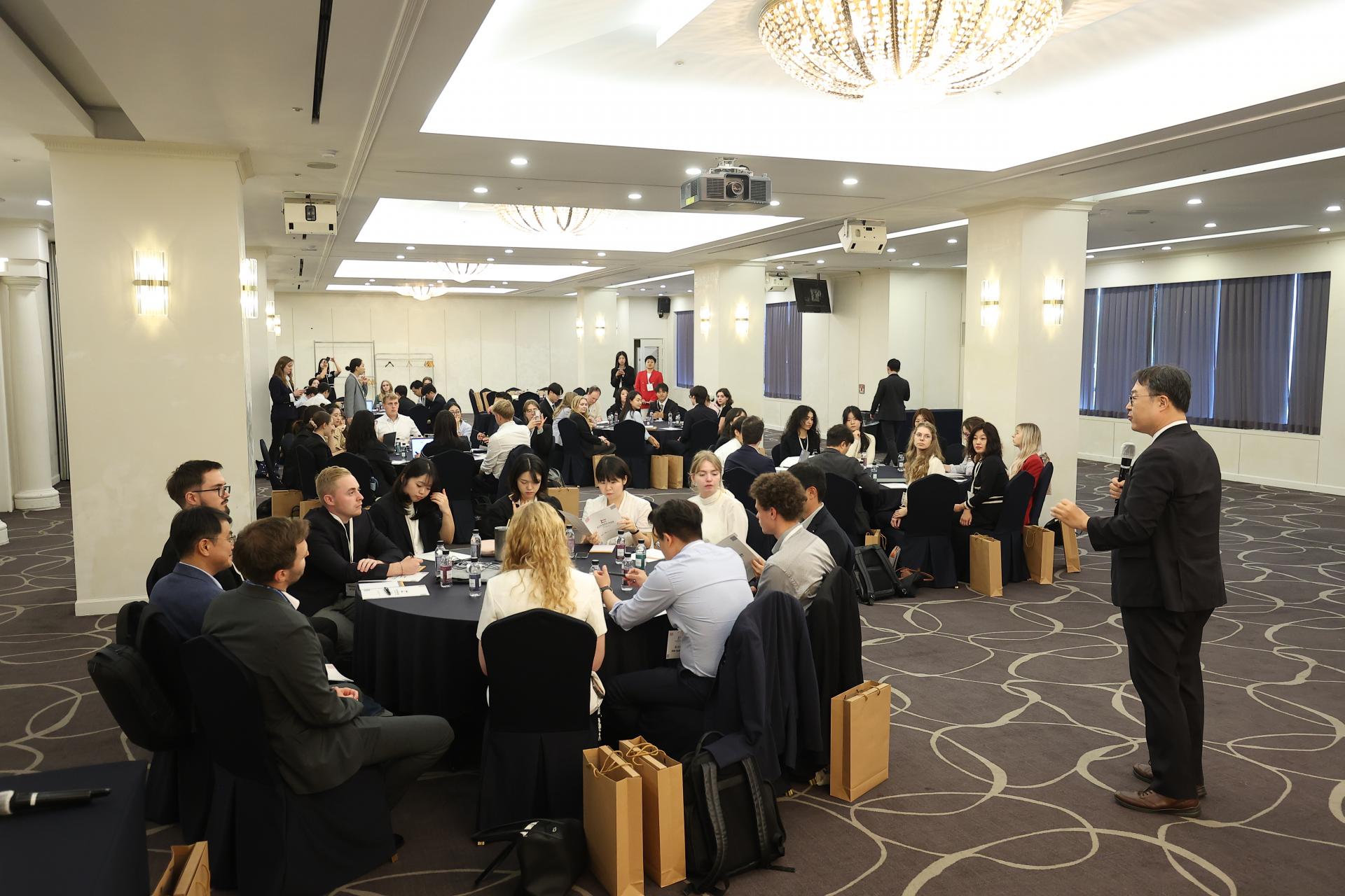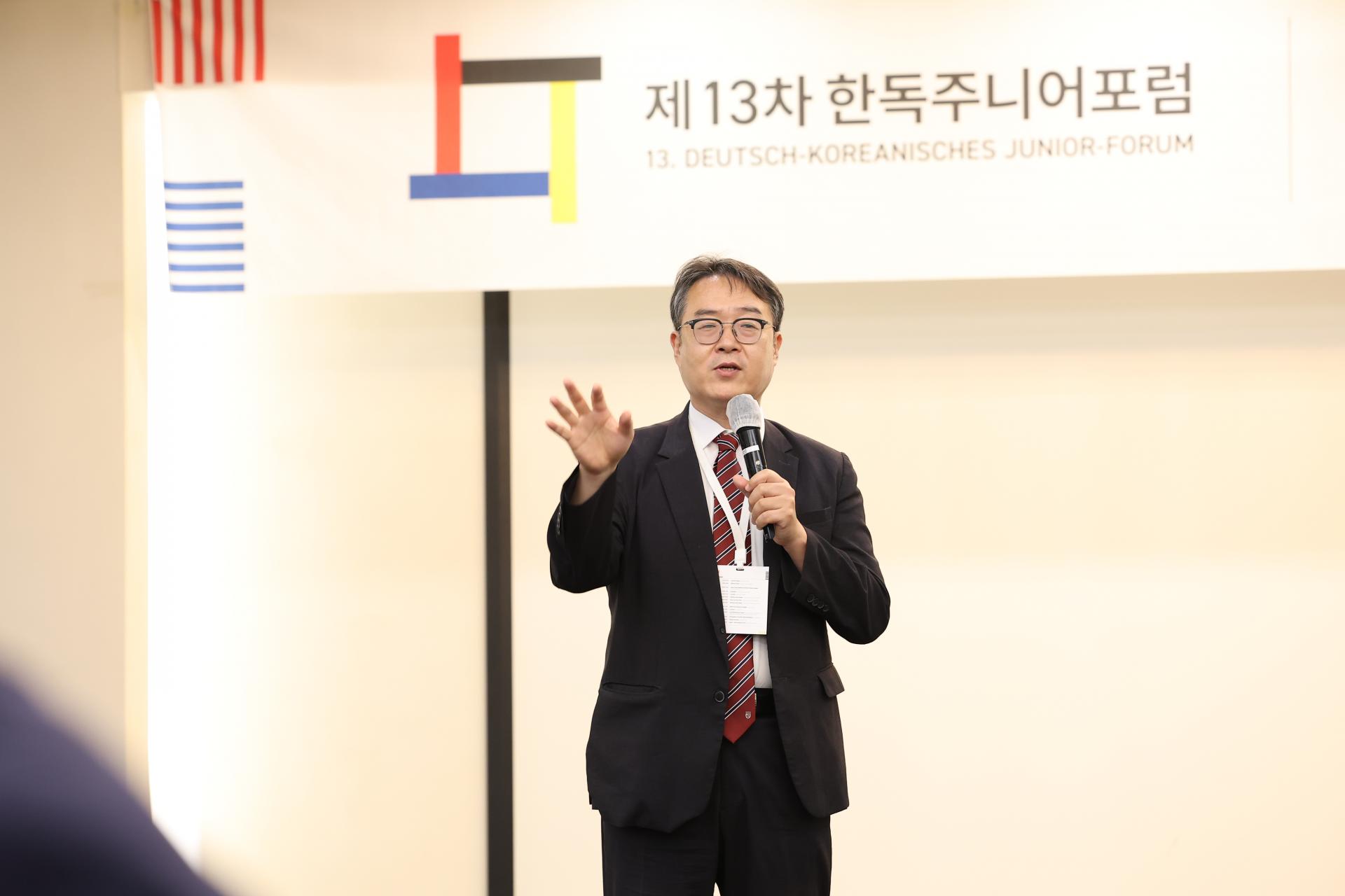 Nach diesem Auftakt ging es im Samjung Hotel weiter mit der Einführungssession des Juniorforums. Hier sprach Prof. Byung Jun Lee, Vorsitzender des ADeKo Korean-German Junior Forum Committees, ermutigende Worte an die Teilnehmenden, die vor einem langen und intensiven Arbeitstag standen.