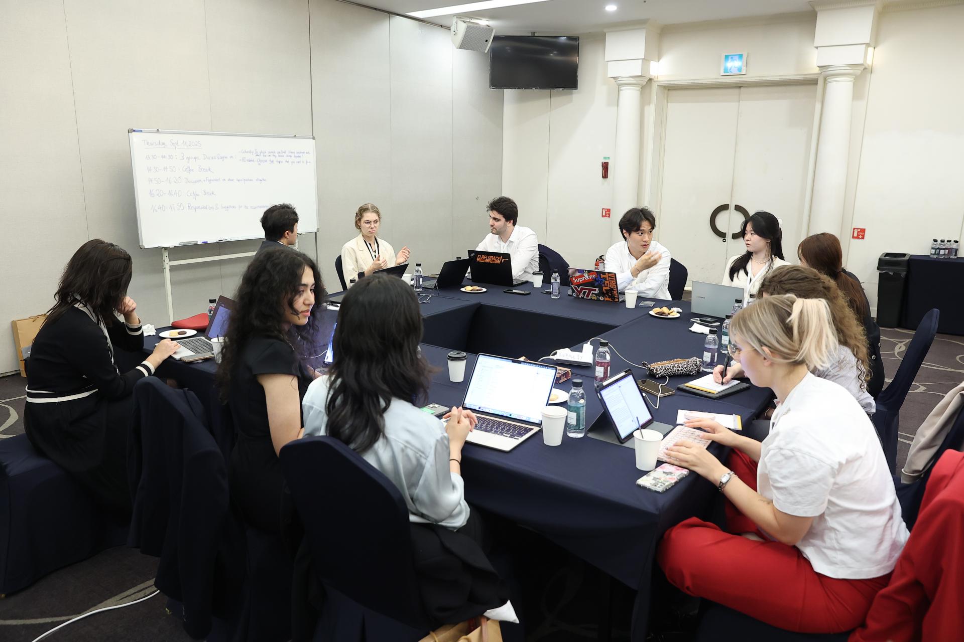 Dabei ging es nicht nur um Inhalte: Die Sitzungen boten auch wertvolle Gelegenheiten zur interkulturellen Kommunikation. Jede Arbeitsgruppe arbeitete in einer festgelegten Sprache – Englisch, Koreanisch oder Deutsch – wodurch die Teilnehmenden ihre Sprachkenntnisse praxisnah erweitern und vertiefen konnten.